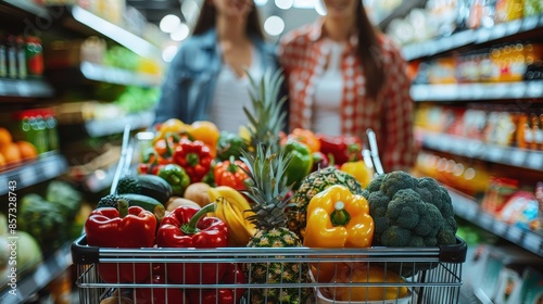 Two women stand in the produce aisle of a grocery store selecting a variety of fresh fruits and vegetables that fill their shopping cart during their grocery shopping trip.