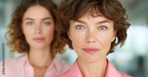 Two women stand side-by-side wearing pink shirts. Intergenerational, mother daughter, family connection, relationship, love, togetherness