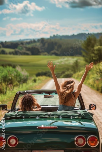 Two women traveling in the back of an open top convertible car on country road, arms raised up to feel wind and air