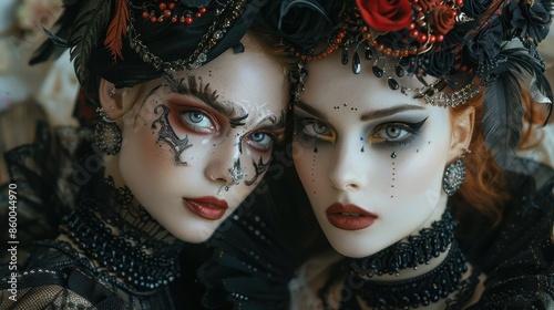 Two women with intricate face paint and elaborate accessories, incorporating gothic and baroque elements, creating a visually stunning image with a deep sense of artistry.