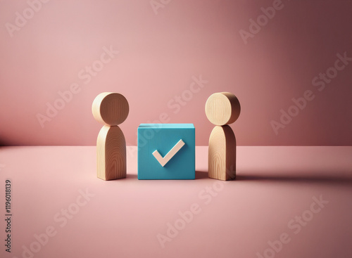 Two wooden figures stand beside a teal cube displaying a checkmark, signifying agreement, completion, or a shared decision on a pink background.