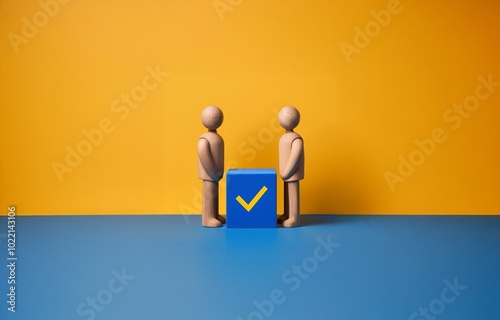 Two wooden figures stand on a blue surface in front of a blue cube with a yellow checkmark.