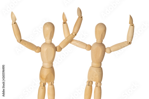 Two Wooden Mannequin Hands Up as Winners. Isolated White Background.