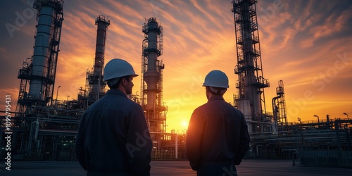 Two workers in hard hats observe a sunset over industrial structures, highlighting the blend of nature and technology in the energy sector.