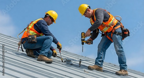 Two workers in orange safety vests and yellow hard hats install equipment on a metal roof under a clear blue sky.