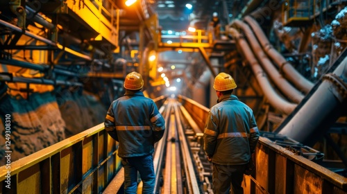 Two workers in safety gear stand quietly as they watch metal tracks in an industrial environment, lit by various lights, creating a striking contrast with the dark surroundings.
