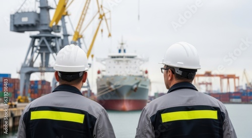 Two workers in safety helmets at a port watching a large cargo ship.