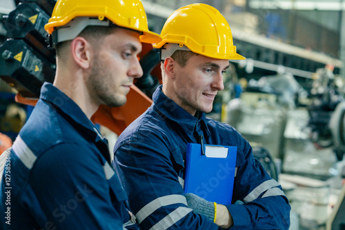 Two workers in safety helmets discuss their project in a manufacturing facility during the afternoon shift