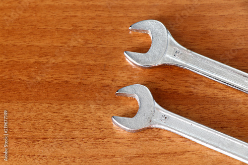 Two wrenches on a wooden background.
