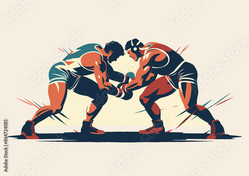 Two wrestlers grappling in a stylized illustration. They are wearing singlets and headgear.. Olympics in France 2024.