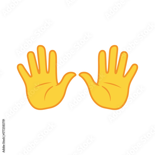 Two yellow cartoon hands with fingers spread open, palms facing forward, isolated on white.