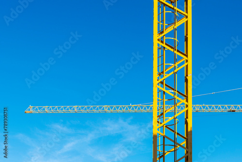 Two yellow construction cranes forming a cross as abstract background