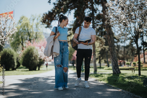 Two young adults engaged in studying with books after class time in a lively, sunlit city park.