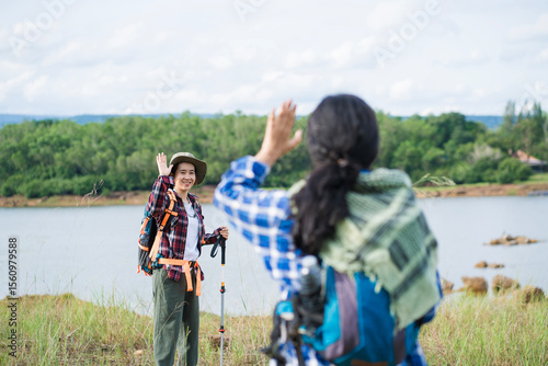 Two young Asian female hikers enjoying an outdoor adventure in nature. Exploring scenic trails, embracing freedom and fresh air during their trekking journey