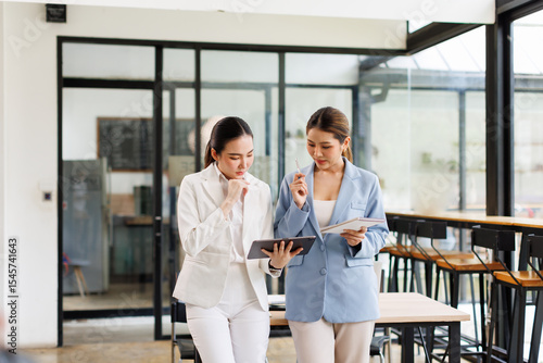 Two Young Asian Happy business women standing and holding tablet in hand confidence leadership in a modern office environment investment market at office.
