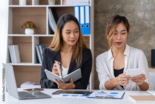 Two young Asian women sitting at a desk check their accounts and look at the information to calculate them with their calculators and take notes in their books.