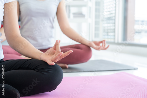 Two Young beautiful asian sport women sitting on the yoga mat practicing meditation. Fitness or exercise at home. Beautiful females relaxing after workout.
