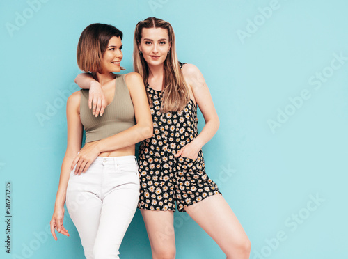 Two young beautiful smiling brunette hipster female in trendy summer clothes. Sexy carefree women posing near blue wall. Positive models having fun. Cheerful and happy