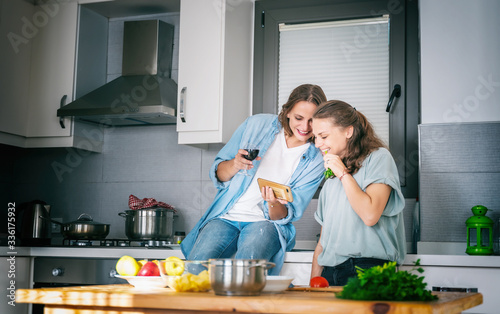 Two young beautiful women girlfriends lesbian couple cook at home in the kitchen, look at the smartphone and laugh merrily, home activity, cooking, recipes, stay at home