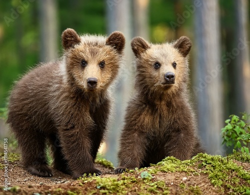 two young brown bear cub in the forest portrait of brown bear animal in the nature habitat