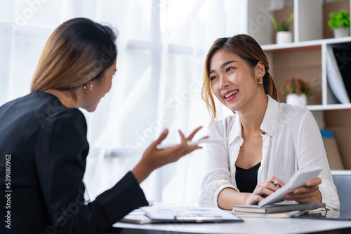 Two young businesswomen pointing to plans, statistics, and data graphs and explaining the conditions of their partnership, happily acknowledging their turnover and income during negotiations.