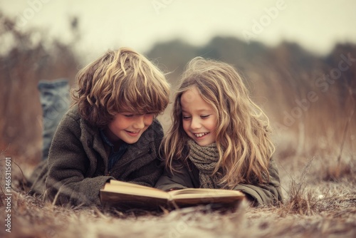 Two young children are happily immersed in a book while relaxing in a tranquil outdoor setting.