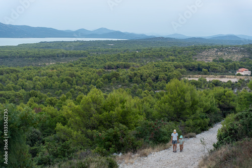 Two young children walking on rocky path through lush green forest with hills and house in the distance on summer day. Concept of family adventure, outdoor activities, connection with nature.