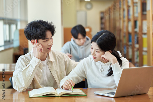Two young college student man and woman couple model and solo male model looking at laptop and book together in library of Asian Korean university