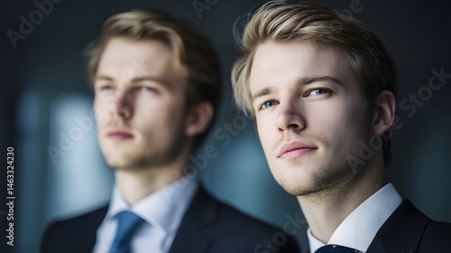 Two young executives in formal business attire captured in a professional upper body portrait with elegant lighting and soft blurred office background, conveying leadership, corporate confidence