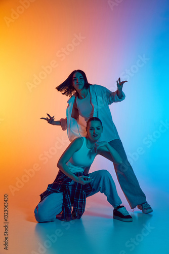 Two young female hip hop dancers i casual clothes energetically performing against gradient studio background in neon light. Concept of modern dance, rhythm, freestyle, artistic expression, youth.