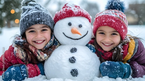 Two young girls joyfully pose with a cheerful snowman in a snowy setting.