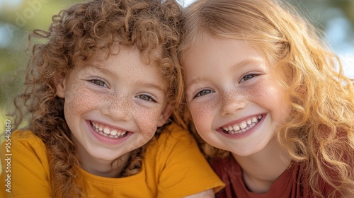 Two young girls with red hair and freckles are smiling at the camera, showcasing their playful and joyful personalities. They are wearing casual clothes and are likely enjoying a day outdoors, represe