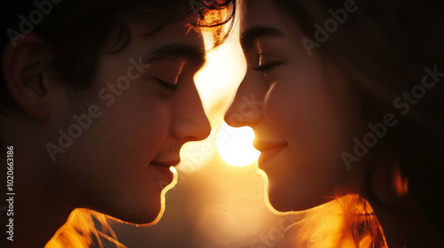 Two young individuals gazing into each other's eyes during a golden sunset, capturing a moment of deep connection and romance
