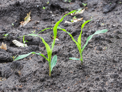 Two young maize plants in earth