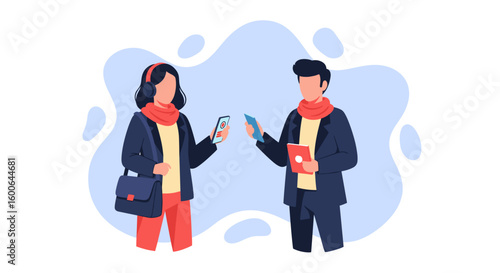 Two young professionals collaborating using smartphones and a notebook. Perfect for websites, presentations, and marketing materials.
