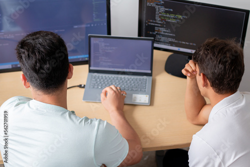 Two young programmers in an office, preoccupied as they work on a programming and technology project