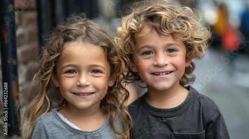 Two young siblings smiling happily while standing close together outdoors, showing their bond and sibling love.