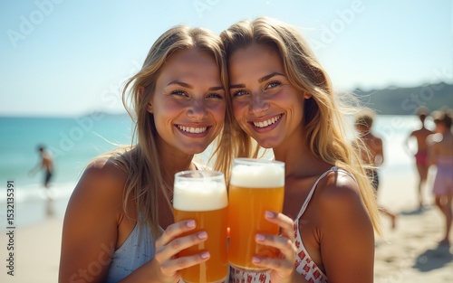 Two young woman with beer at beach party. Summer holiday, vacation concept. Friendship and celebration concept. High quality