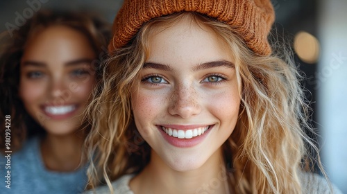 Two young women enjoy a cheerful moment indoors while wearing cozy winter outfits in a warm, inviting atmosphere during daylight