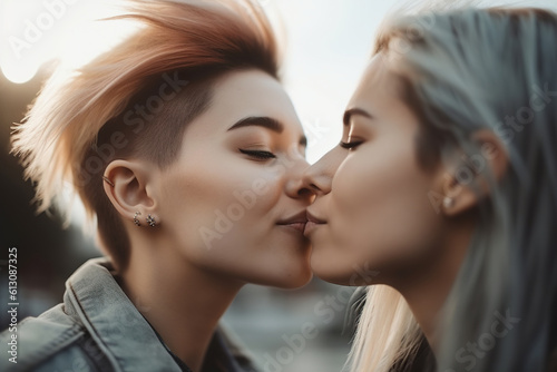 Two young women spending time together, kissing. LGBT, lesbian couple, relationship. Diversity, homosexuality. Partners with non-traditional sexual orientation. Sensual moment. Generative AI.