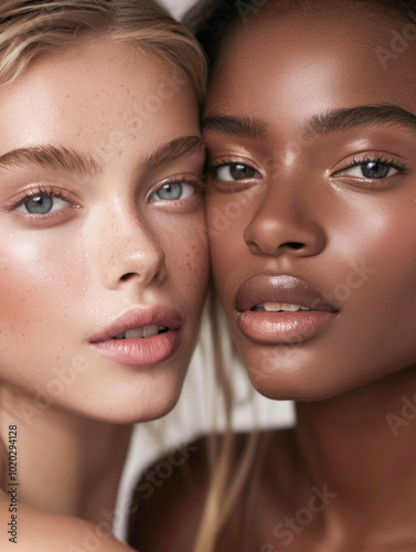 Two young women with contrasting skin tones standing close together, showcasing natural beauty and diversity. Concept of beauty, friendship, and inclusion