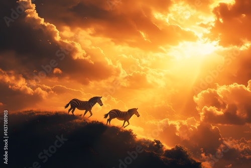 Two zebras running on a dark hill against a bright orange sky with fluffy clouds at sunset time