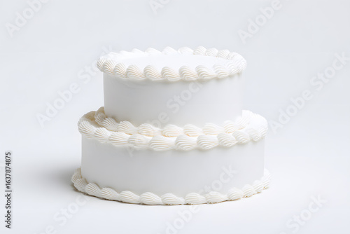 Two-tier white wedding cake with minimalist icing. Clean and formal design for wedding or celebration content.
