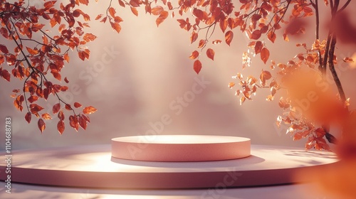 Two-Tiered Circular Platform with Autumn Leaves and Sunlight
