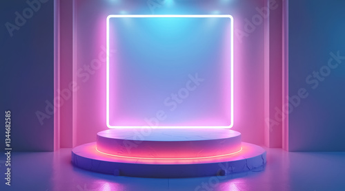two-tiered cylindrical platform with vibrant pink and blue neon glow