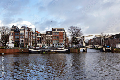 Typical Amsterdam cityscape. Amsterdam canals, boats and dutch architecture, Netherlands