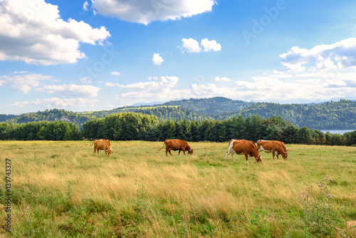 Typical cows on the summer pasture in Pieniny mountains in Poland.