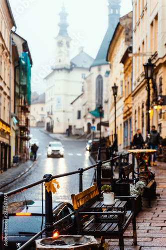 Typical European City Scene Cathedral Church Architecture Overcast Weather Street Outdoors