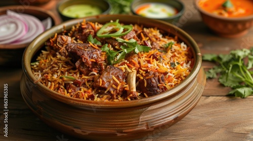 Typical Indian Mutton Biryani Dish on Wooden Table