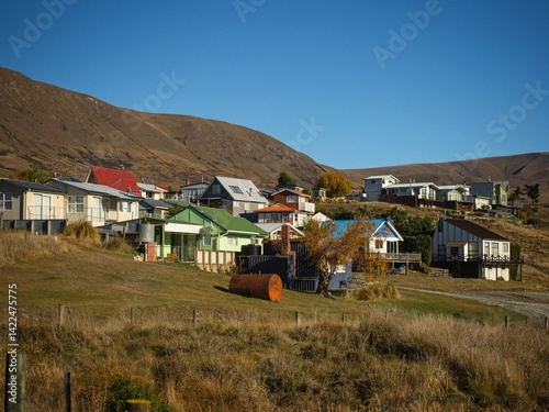 Typical New Zealand architecture house buildings at Lake Clearwater Village Town summer destination on golden grass hills, Ashburton Lakes Canterbury